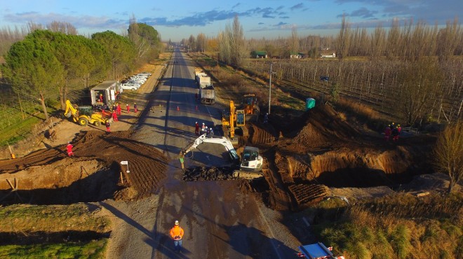 Cerca del mediodía la máquina excavadora ya había completado el zanjeo y comenzaba el trabajo de arrastre de los cuatro caño camisa de 12 pulgadas para que los ductos crucen desde el norte hacia el sur de la ruta.