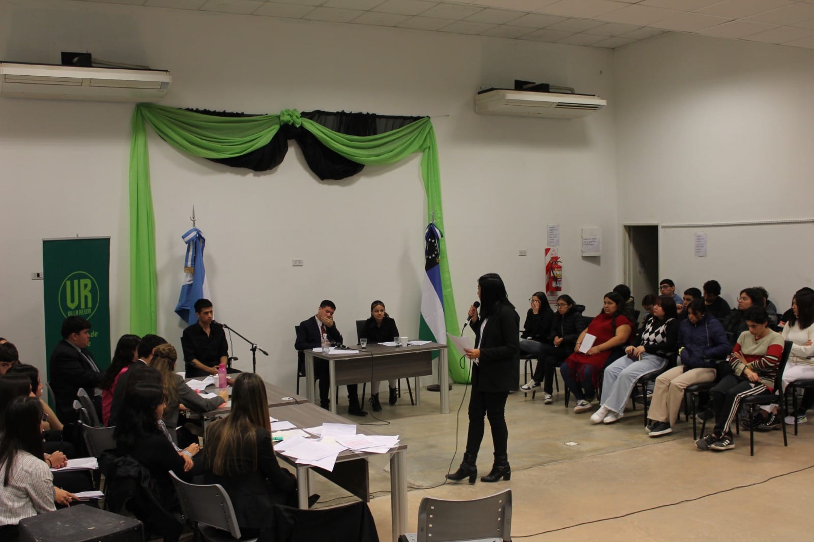 Estudiantes de quinto año de dos escuelas secundarias protagonizaron este viernes un simulacro de juicio por jurados en Villa Regina. Dos cursos del Instituto Secundario Niño Jesús se distribuyeron los roles de la acusación y la defensa, mientras que un curso de la ESRN N° 56 de General Enrique Godoy integró el jurado popular, que terminó emitiendo un veredicto unánime de absolución.