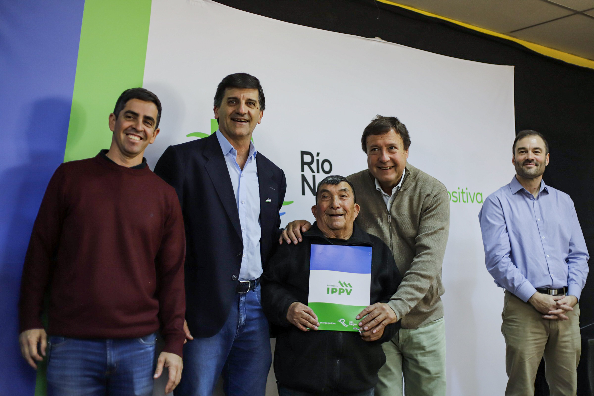 Cada una de las escrituras entregadas fue en presencia del Gobernador, Alberto Weretilneck, acompañado por el Ministro de Obras y Servicios Públicos, Alejandro Echarren y el Interventor del IPPV, Mariano Lavin, además de las y los intendentes de las localidades donde hubo entrega.
